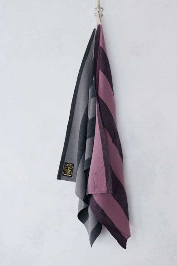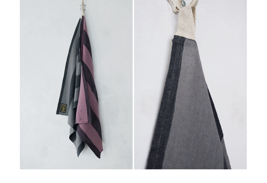 昔ながらの染色方法の東炊きの手法を取り入れた「オーバーダイリネンストライプ」生地を使ったキッチンクロス。