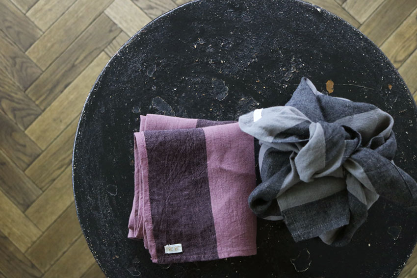 昔ながらの染色方法の東炊きの手法を取り入れた「オーバーダイリネンストライプ」生地を使ったハンカチ。