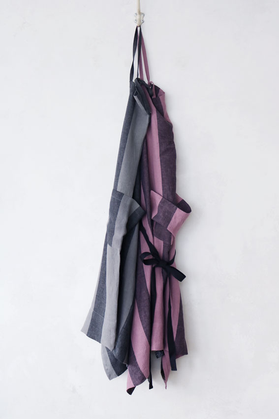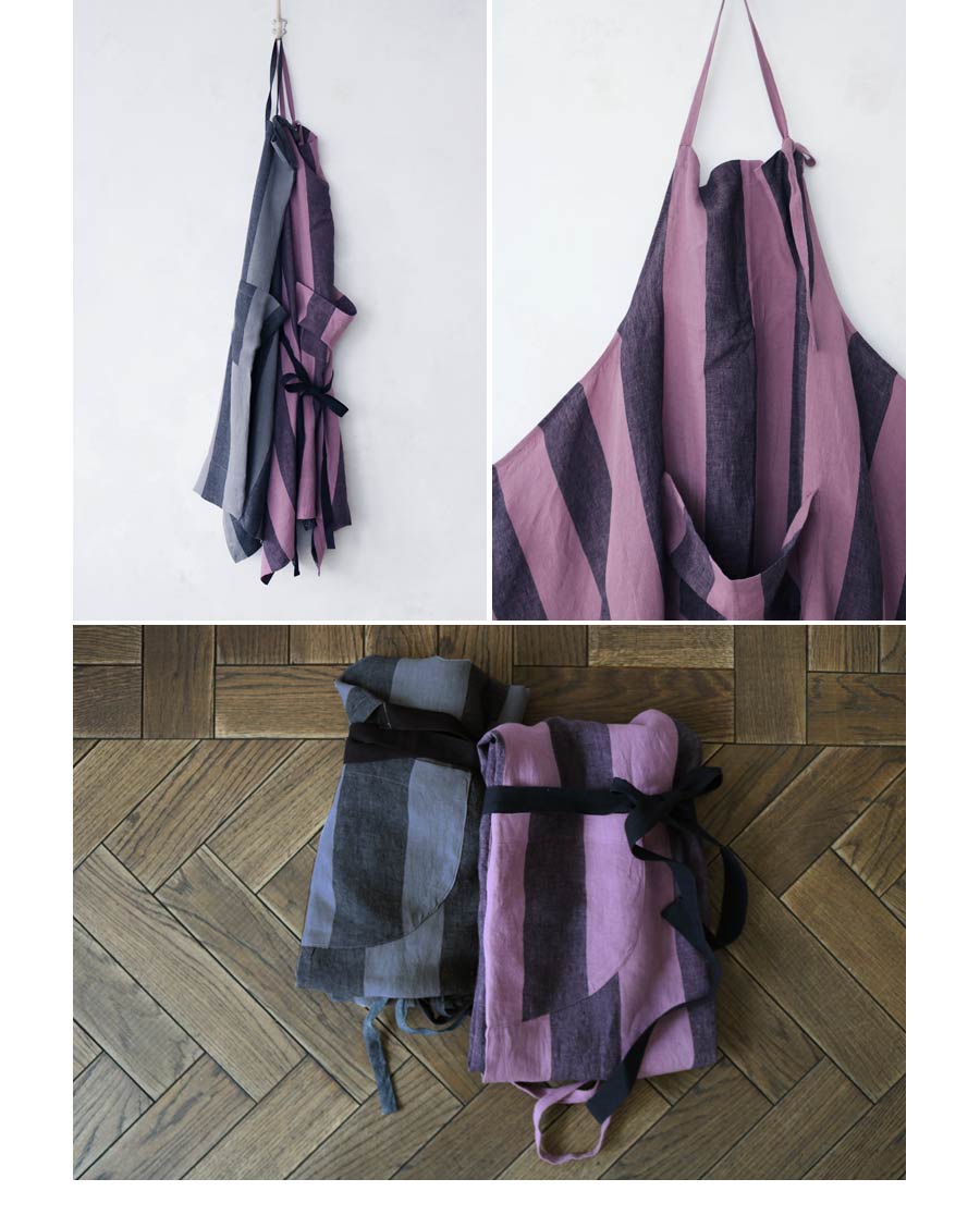 昔ながらの染色方法の東炊きの手法を取り入れた「オーバーダイリネンストライプ」生地を使ったエプロン。