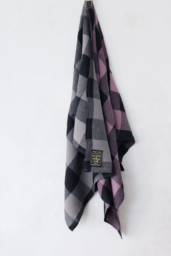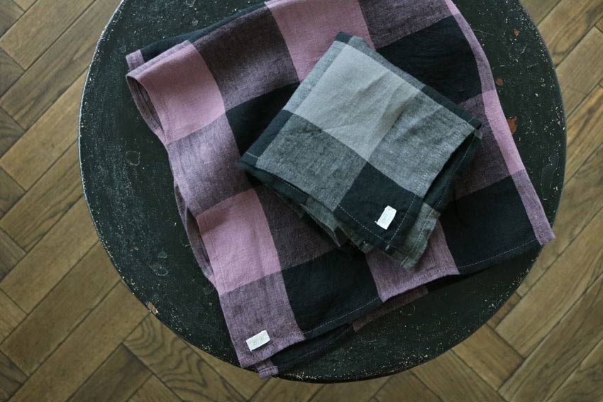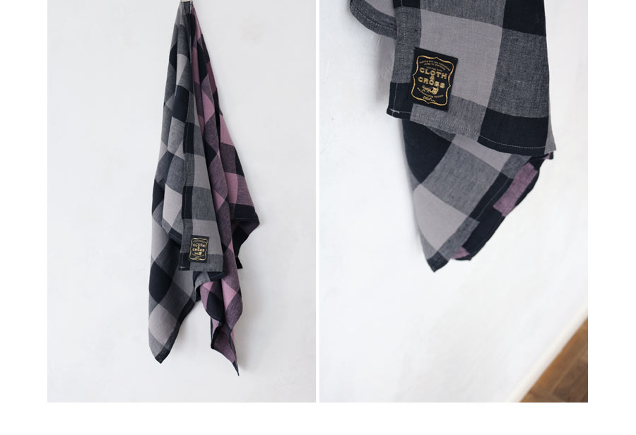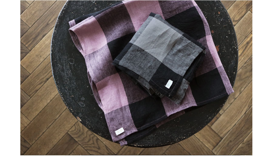 昔ながらの染色方法の東炊きの手法を取り入れた「オーバーダイリネンブロックチェック」生地を使ったキッチンクロス。