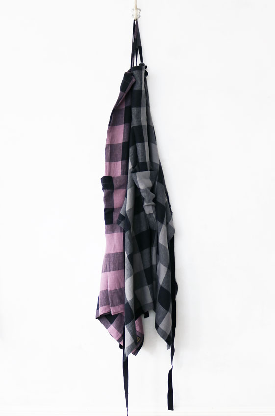 昔ながらの染色方法の東炊きの手法を取り入れた「オーバーダイリネンブロックチェック」生地を使ったエプロン。