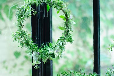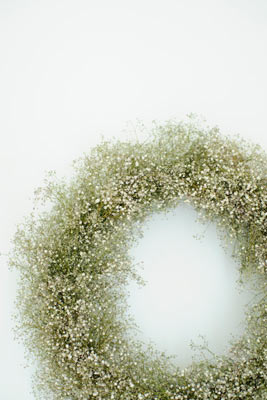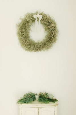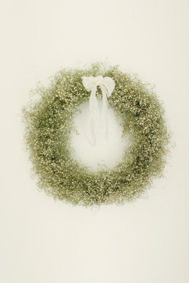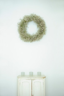 クロス&クロスの玄関にある、大きなかすみ草のリース。 |
