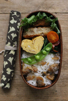 玉子焼き、プチトマト&スナップえんどう、若炊あさりの佃煮まぜご飯。 |